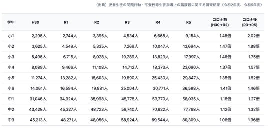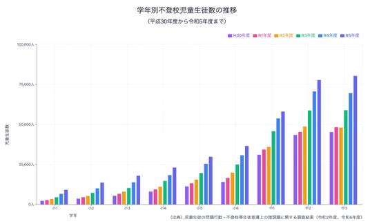 さらに学年別で見ると、小学校低学年の段階から不登校の数が増える傾向が年々強まっています。特にコロナ禍後では大きく増加していることがわかります。学習ペースや対人関係、オンライン授業の有無など多角的な要因が絡み合っており、早い段階で新しい学び方やサポート体制を検討する必要があります。