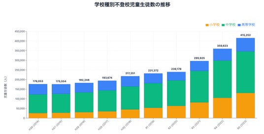 文部科学省の最新調査(令和5年度児童生徒の問題行動・不登校等生徒指導上の諸課題に関する調査結果)によると、小中高生の不登校児童生徒総数はH26(2014年)時点の約17.6万人から、R5(2023年)には約41.5万人に達し、約2.4倍に増加しています。学校種別にみると以下のとおりです。