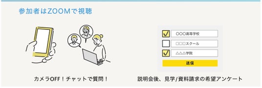 イベント終了後にアンケートに答えるだけで、希望する学校のパンフレット請求や見学予約が可能です。