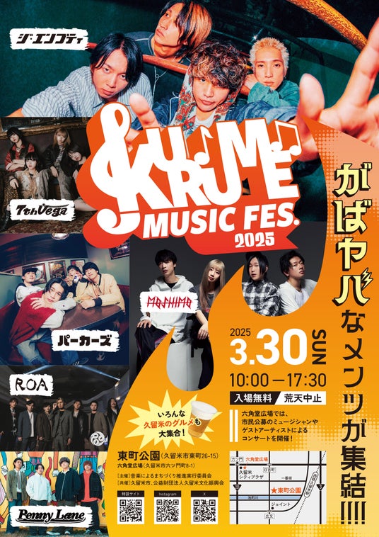 「KURUME MUSIC FES.2025」は、2025年3月30日、福岡県久留米市の東町公園をメイン会場として開催します。地元久留米出身、全国で人気急上昇中のジ・エンプティをはじめ、MOSHIMO、パーカーズなど、全国で名のあるアーティストが集結。