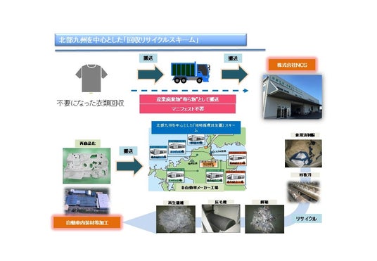 チクマでは、不要になった衣類のリサイクルに取り組んでいます。福岡県北九州市との共同事業であるマテリアルリサイクル企業、NCSを活用し、回収された一般家庭で不要となった衣類は、NCSにて自動車内装材料にリサイクルされ、新たな製品に生まれ変わります。